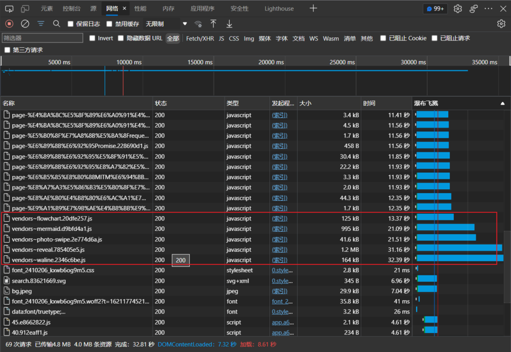 一开始尝试了 gzip,略有提升,但是效果不大,通过浏览器的 devTool 发现,个别文件要加载很久,也就是三十多秒,因为 http/1.1 是单线程串行请求,所以这些请求就阻塞了后面的请求,导致了后面请求一直在等待(?线头阻塞)。